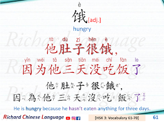 [3] 我肚子很饿。 wǒ dù zi hěn è 。 My belly is hungry.
